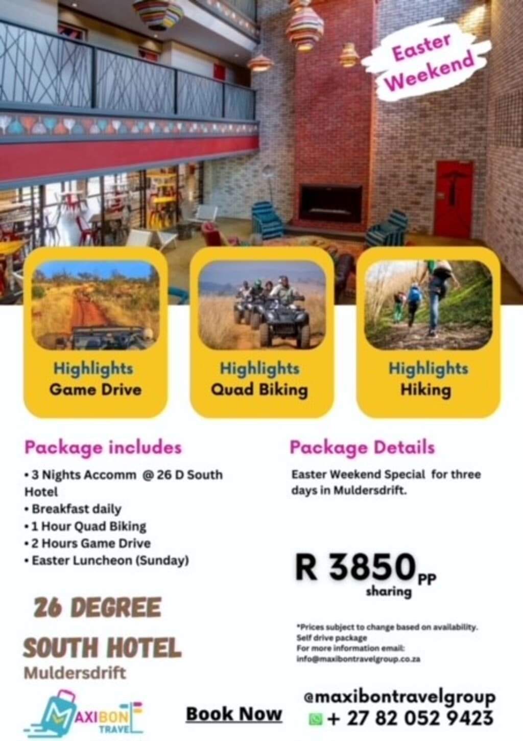 Special package at 26 Degrees South Boutique Hotel and Spa in Johannesburg - includes accommodation, meals, and activities. Book via Maxibon Travel Group for current availability and pricing.