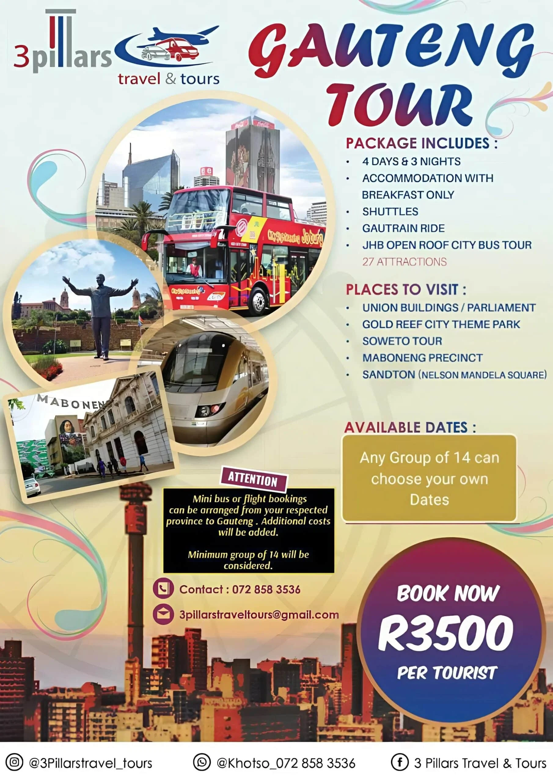 Explore Gauteng – 4 Days, 3 Nights for Only R3500 per Tourist! 3 Pillars Travel & Tours invites you to experience the vibrant heart of South Africa with an unforgettable 4-day, 3-night guided tour through Gauteng. Package Includes: 4 Days & 3 Nights Accommodation (Breakfast included) Shuttles for all local travel Gautrain Ride Experience Johannesburg […]