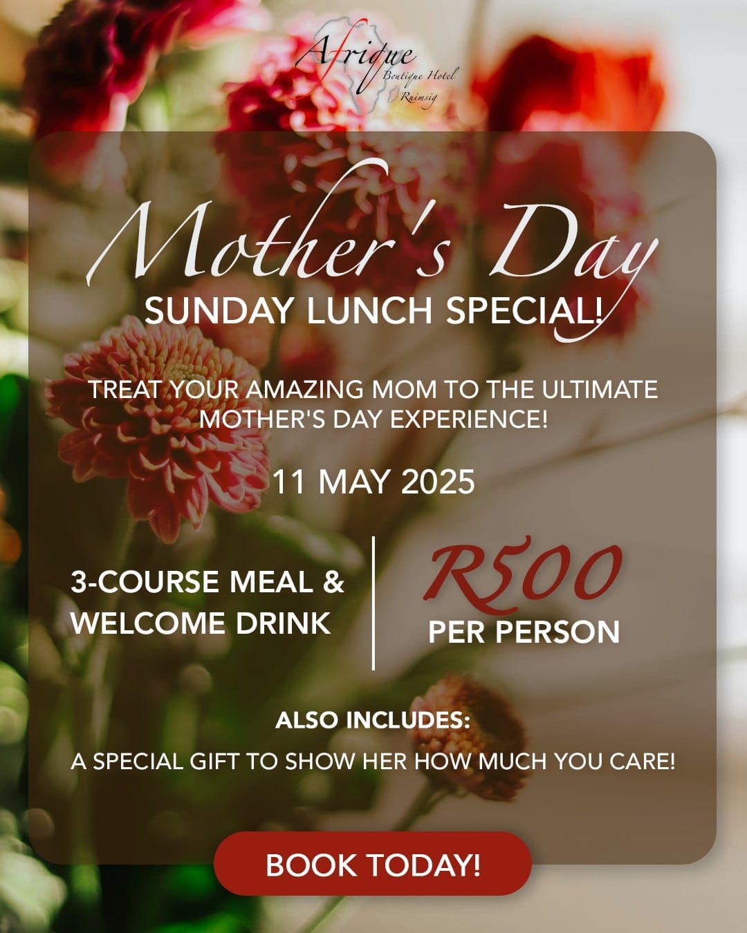 Treat your amazing Mom to the ultimate Mother’s Day experience! 🌹❤ Join us for a delightful Sunday Lunch on Sunday, May 11th for only R500 per person! Your Mom will be treated like royalty with: • A complimentary Welcome Drink • A mouthwatering 3-Course Meal • A special Gift to show her how much you […]