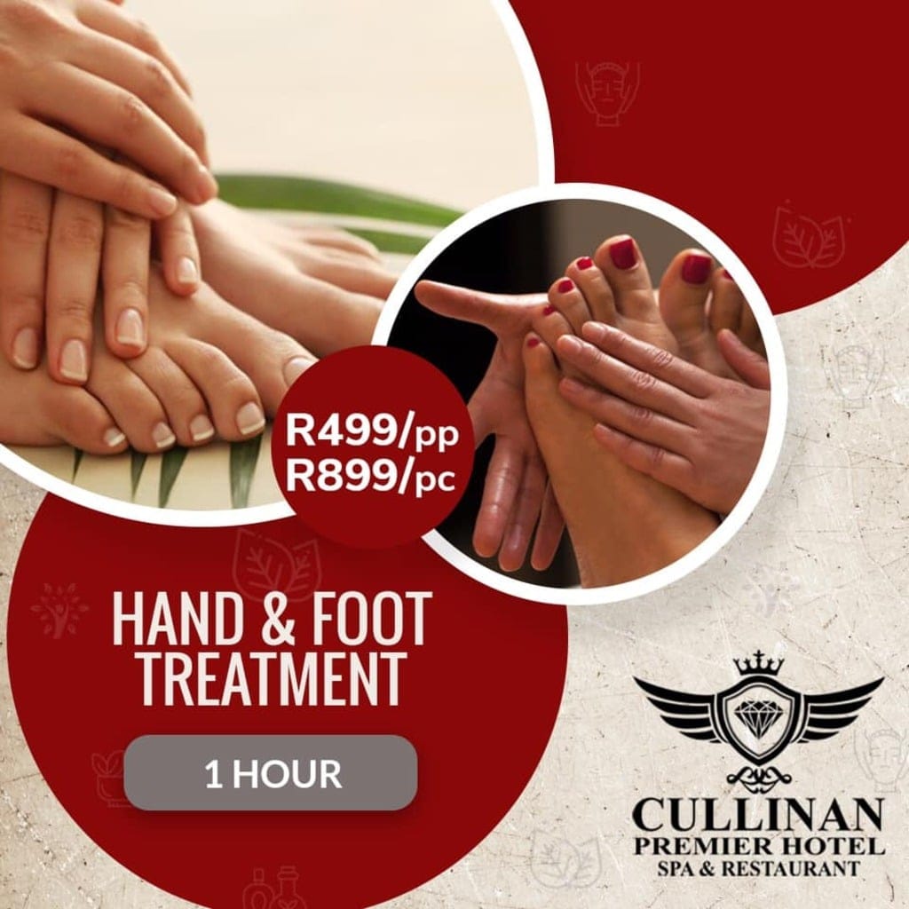 Put Your Feet Up & Let Your Hands Relax! 💅🦶Indulge in a 1-hour Hand & Foot Treatment at Cullinan Premier Hotel Spa & Restaurant.💖 Just R499 per person or R899 per couple – because you deserve pampering from tip to toe! ✨ Smooth. Soothe. Shine. ✨Book your rejuvenation session today!