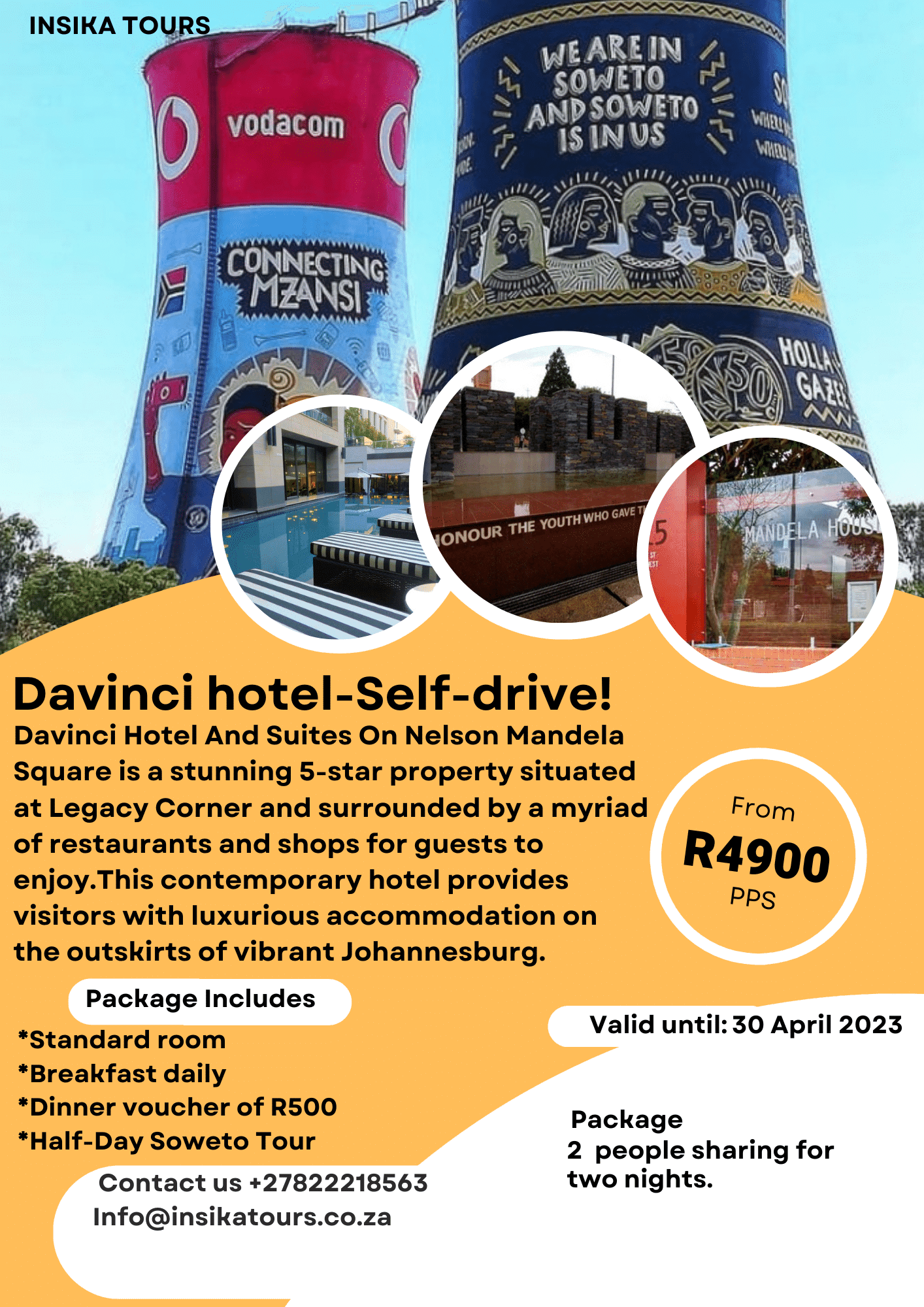 Self-drive package to the DaVinci Hotel and Suites at Nelson Mandela Square, Sandton, facilitated by Insika Tours. Includes accommodation in this stylish hotel above one of Johannesburg's premier shopping destinations.