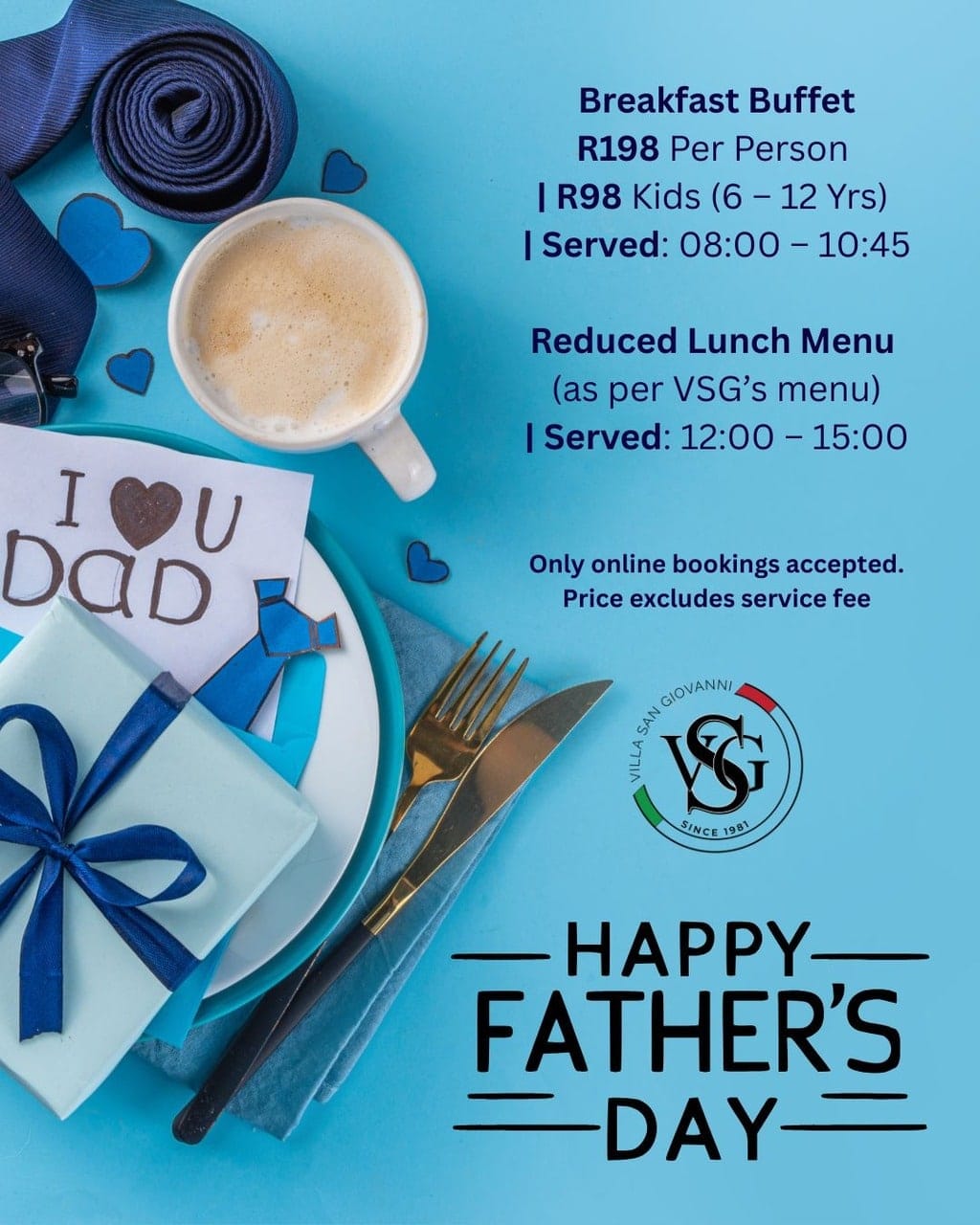 R198 per adult | R98 kids (6–12 yrs) 🕗 Served 08:00 – 10:45 🥩 Reduced Lunch Menu 🕛 Served 12:00 – 15:00 🎟️ Only online bookings accepted (Prices exclude service fee) 📍 Villa San Giovanni, Wonderboom Airport Let’s raise a toast to Dad - buon appetito! Book Now – https://vsg.co.za/product/fathers-day-2025/