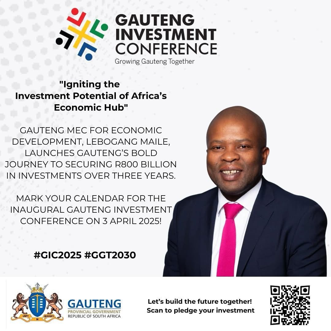 Igniting the Investment Potential of Africa’s Economic Hub GAUTENG MEC FROR ECONOMIC DEVELOPMENT, LEBOGANG MAILE, LAUNCHES GAUTENG’S BOLD JOURNEY TO SECURING R800 BILLION IN INVESTMENT OVER THREE YEARS. MARK YOUR CALENDAR FOR THE INAUGURAL GAUTENG INVESTMENT CONFERENCE ON 3 APRIL 2025!