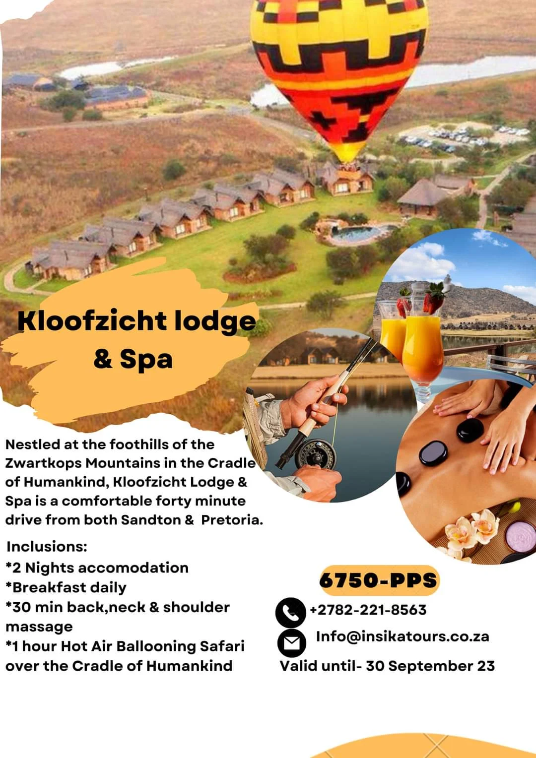 Package to the award-winning Kloofzicht Lodge and Spa in the Magaliesberg, facilitated by Insika Tours. Includes accommodation, breakfast, and spa access in this luxury mountain retreat.