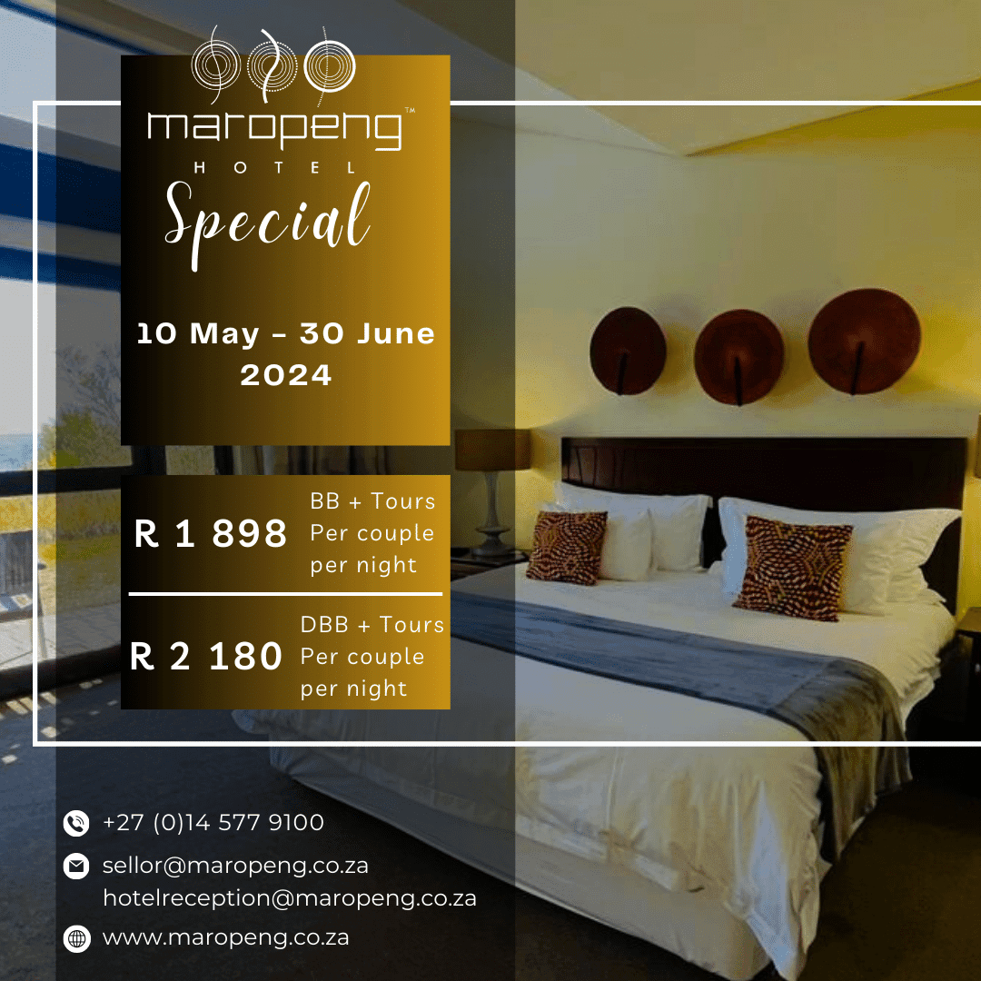 The Maropeng Boutique Hotel, with its breathtaking views of the Witwatersberg and Magaliesberg ranges, is the epitome of luxury accommodation in the Cradle of Humankind. It offers 24 bedrooms, sleeping up to 48 people.