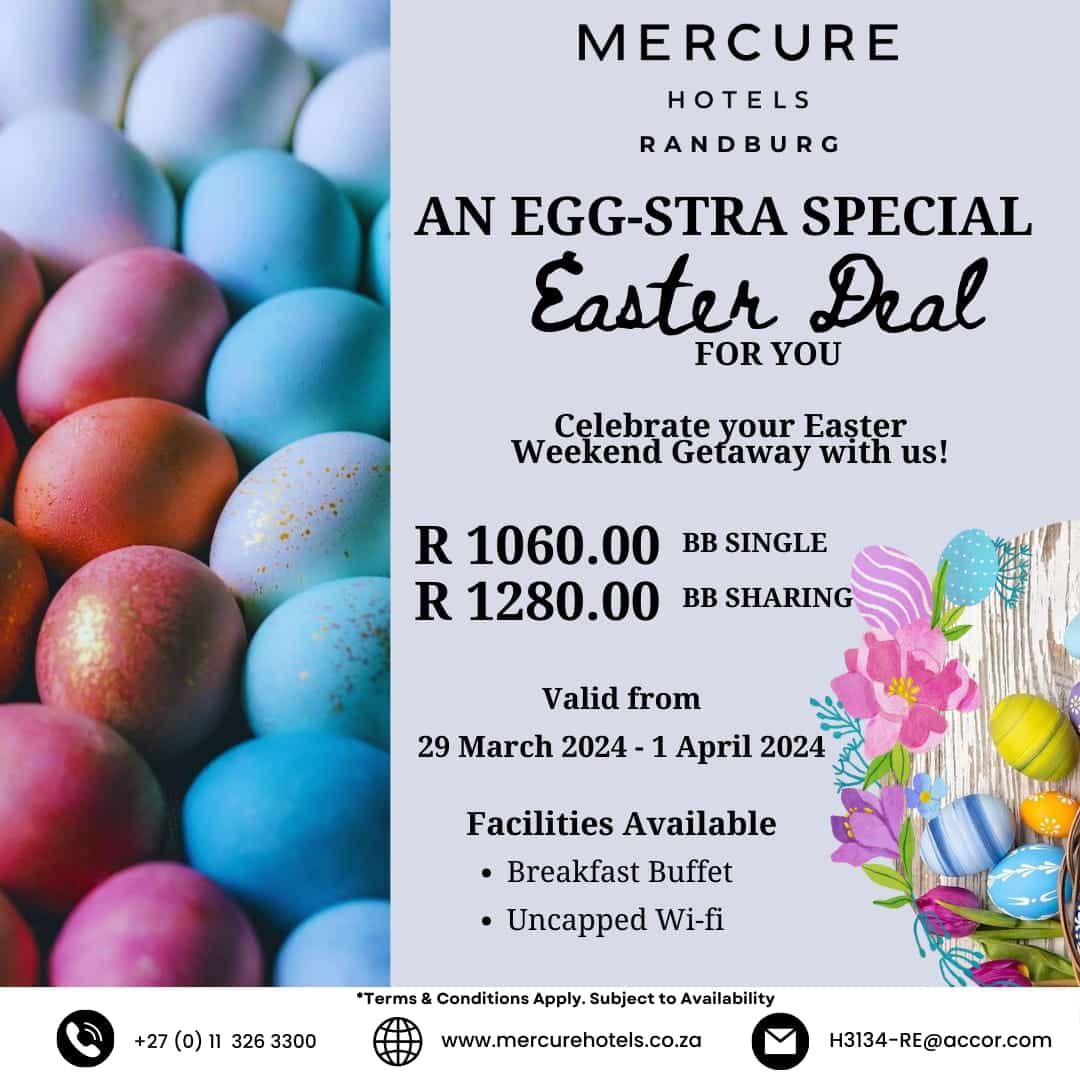 Experience an egg-straordinary Easter with Mercure Hotels Randburg! Our Easter Special is hatching, offering you the chance to enjoy a relaxing weekend getaway from 29th March to 1st April 2024. Book a single BB for just R 1060.00 or share the joy (and the room!) for R 1280.00 BB. Your stay includes a delightful breakfast […]
