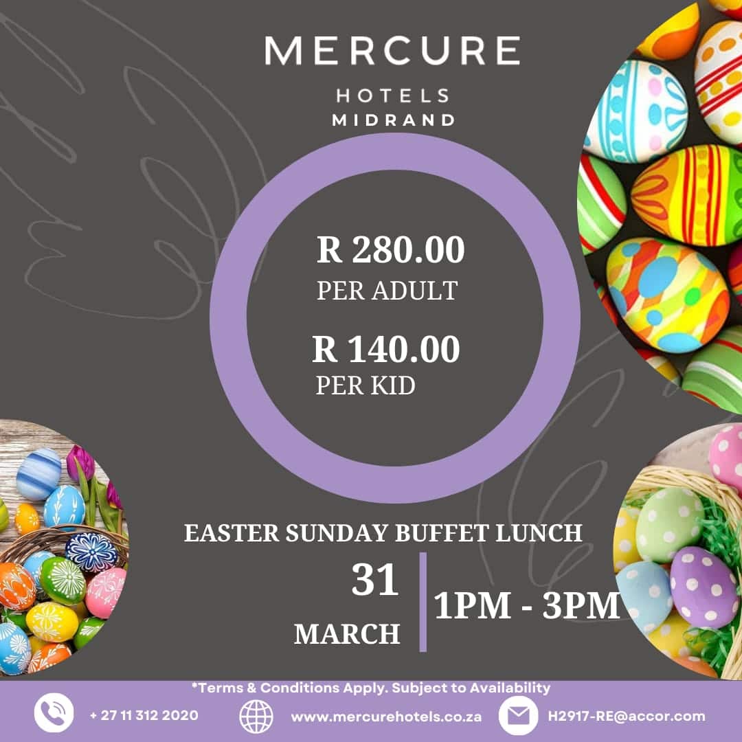 Join us at Mercure Hotels Midrand for a splendid Easter Sunday Buffet Lunch! Indulge in a variety of delightful dishes on the 31st of March from 1 PM to 3 PM. Special rates apply, with adults dining at R 280.00 and kids for just R 140.00. Make your holiday memorable with your family at our […]