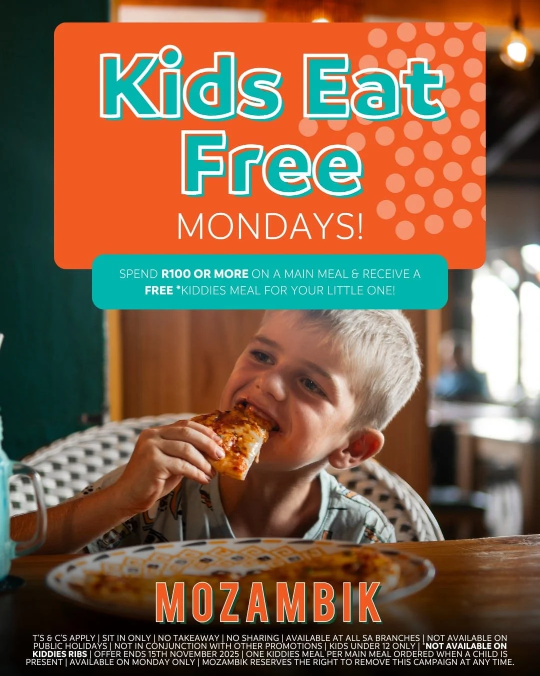 Kids Eat Free Mondays at Mozambik! Kickstart your week with a family feast at Mozambik! Spend R100 or more on a main meal and treat your little one to a FREE kiddies meal. It’s the perfect way to enjoy delicious dining without breaking the bank. Available at all South African branches, so bring the whole family […]