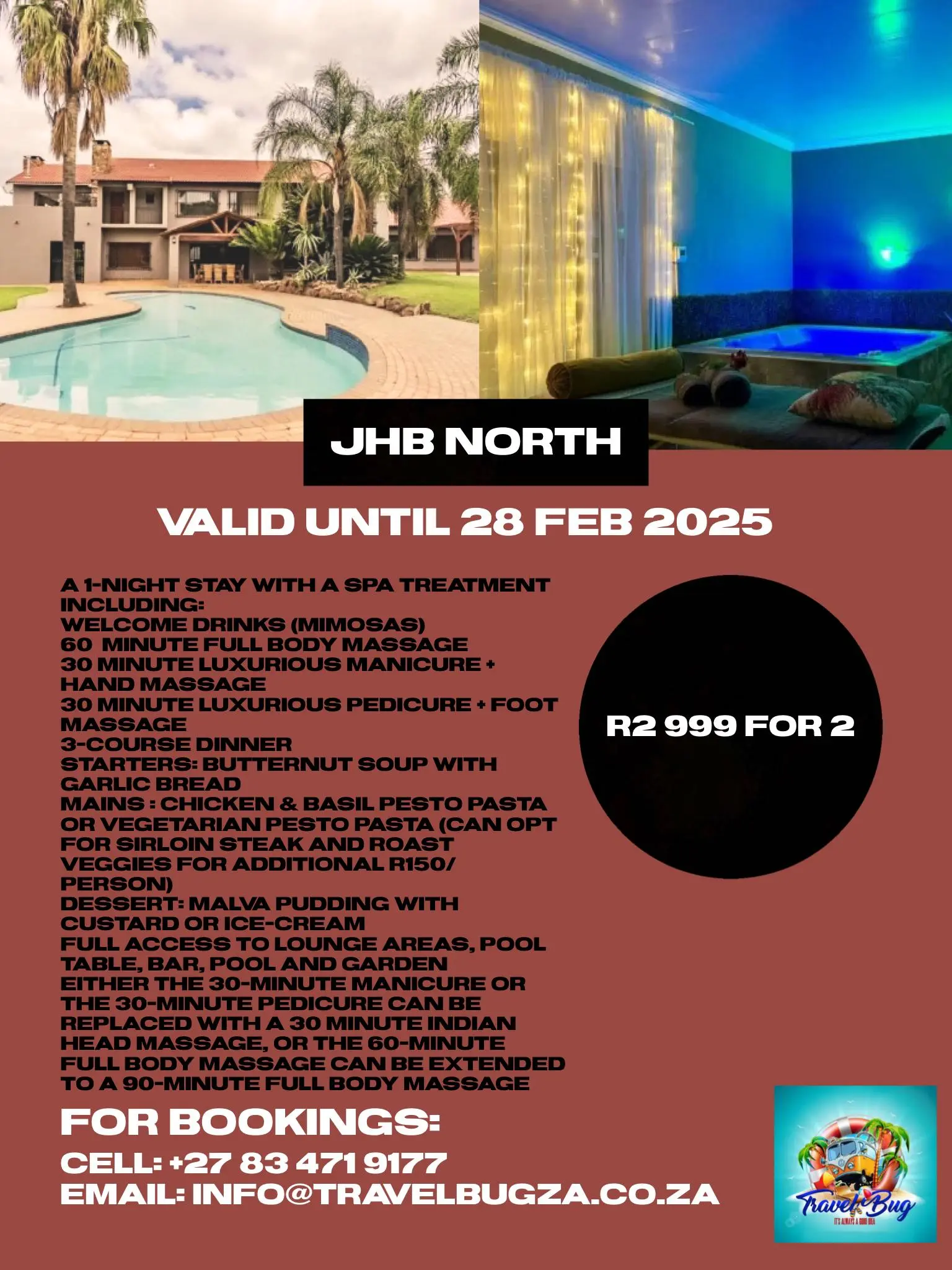 “*1 night stay with spa treatment *welcome drinks(mimosas) *60 min full body massage *30 min luxurious manicure +hand massage *30 min luxurious pedicure +foot massage *3 course dinner Starters: butternut soup with garlic bread Mains: chicken&basil pesto pasta or vegetarian pesto pasta (can opt for sirloin steak & veggies for additional 150pp) Dessert: malva pudding […]