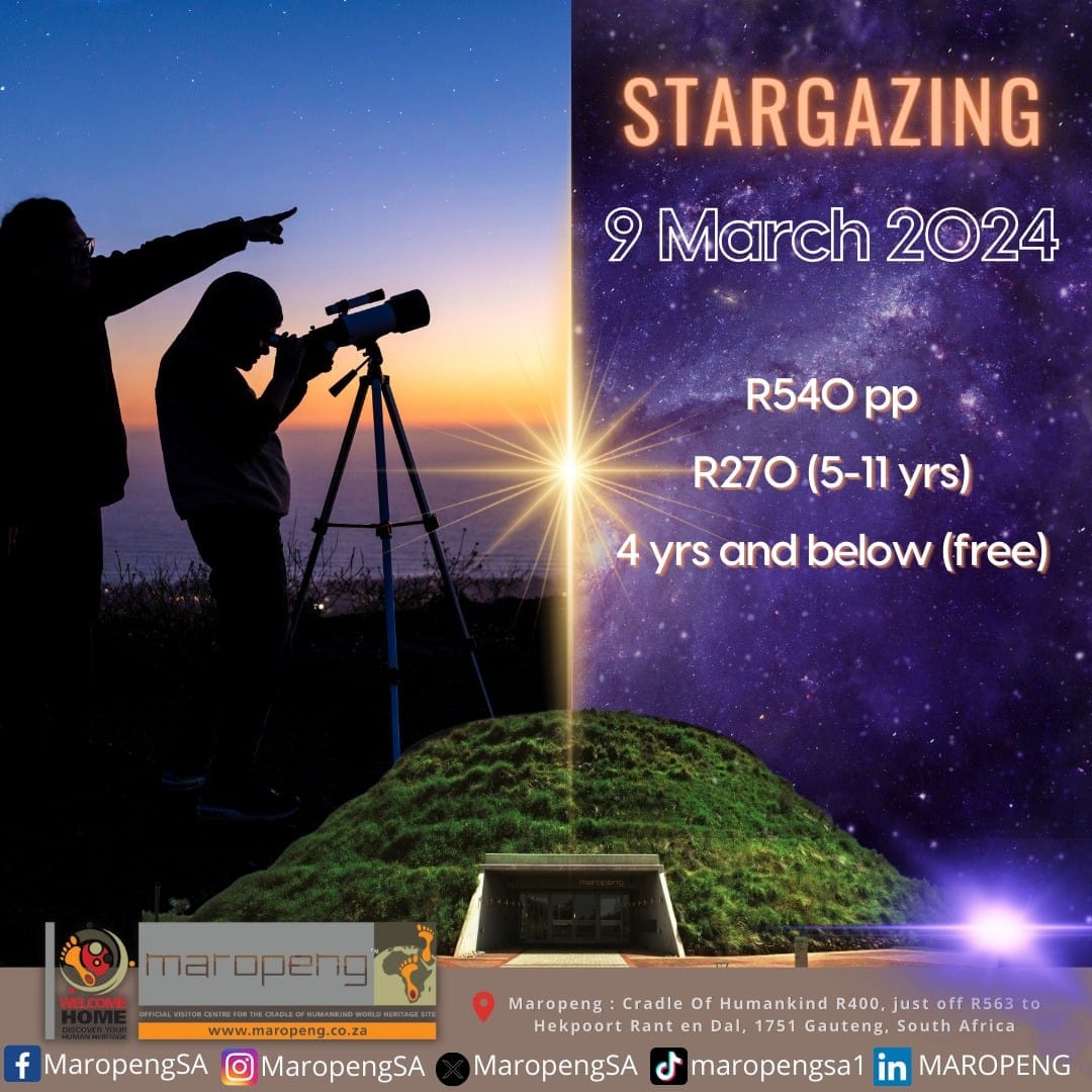 Join us this Saturday (9 March ’24) at Maropeng for an unforgettable night of celestial wonders! Don’t miss out on the chance to learn, eat and stargaze under the captivating night sky. Save the date and let the stars guide your weekend!