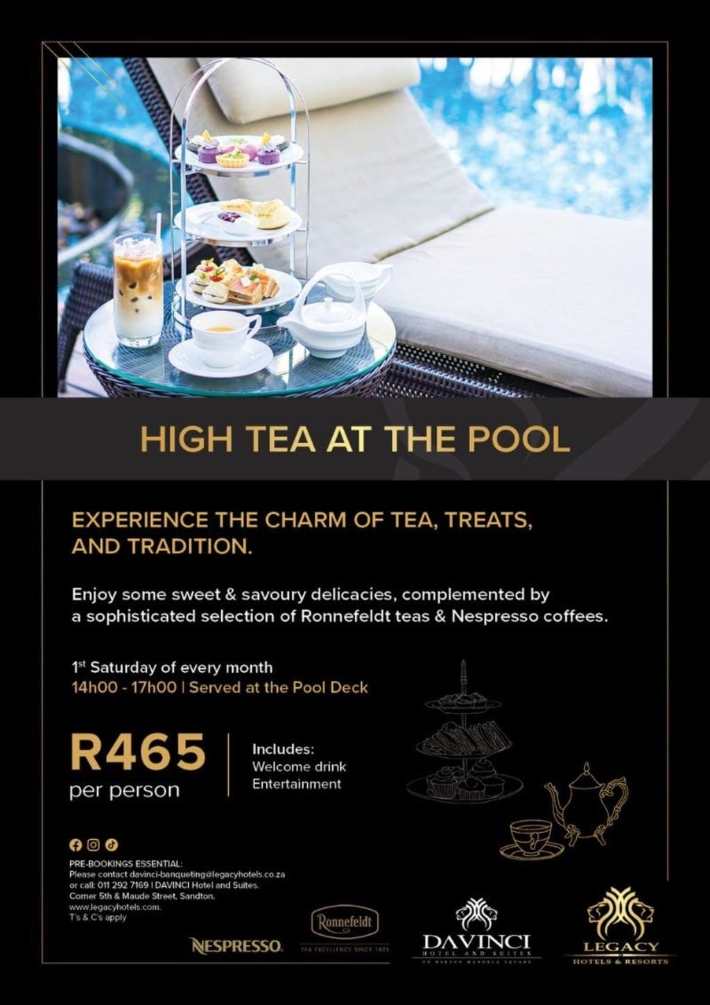 HIGH TEA AT THE POOL EXPERIENCE THE CHARM OFF TEA, TREATS AND TRADITION Enjoy some sweet & savoury delicacies, complemented by a sophisticated selection of Rennefeldt teas & Nespresso coffees 1st Satuday of every month
