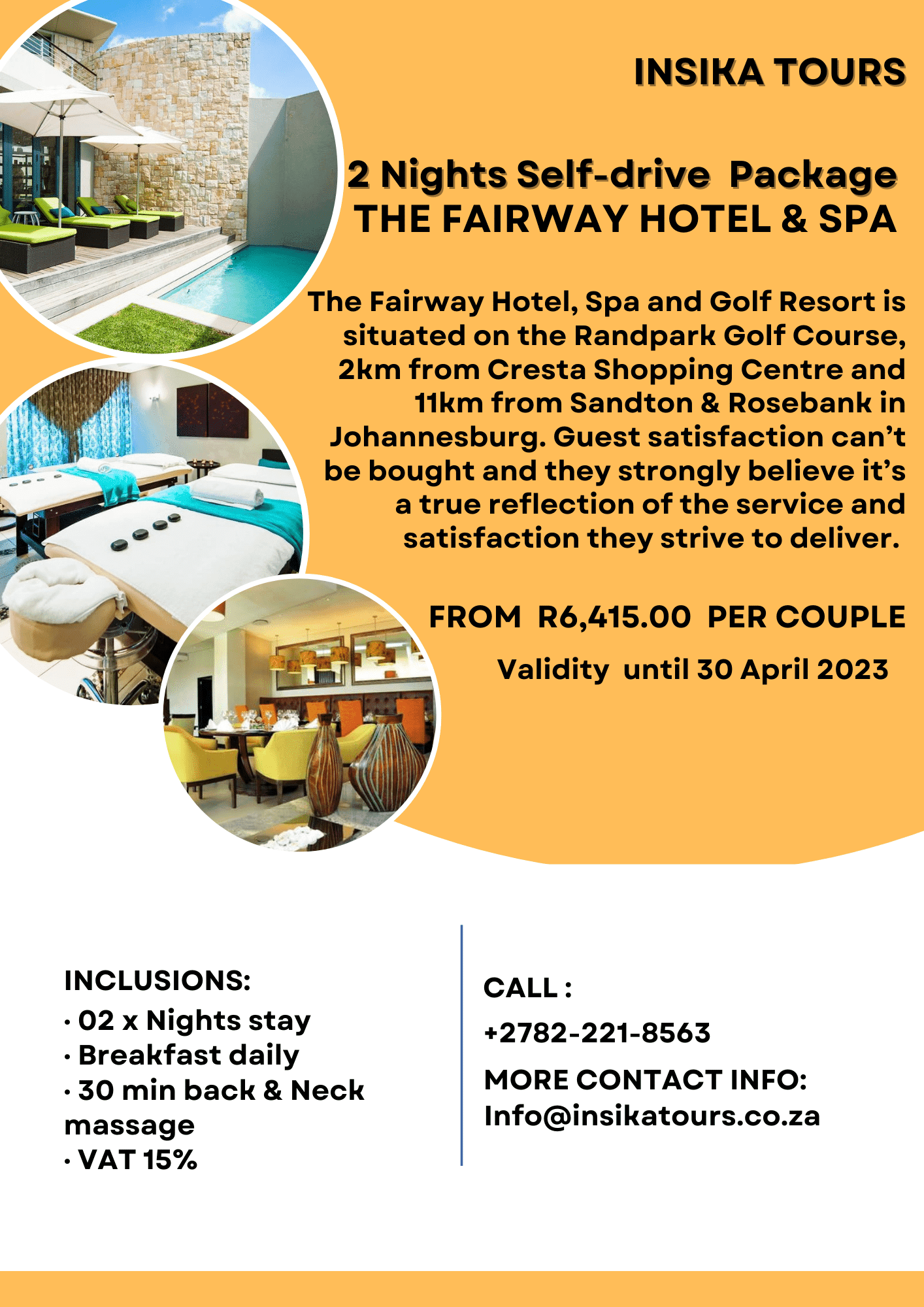 Package to The Fairway Hotel and Spa in Johannesburg, facilitated by Insika Tours. Includes accommodation and spa access at this golf estate hotel with championship fairway views.