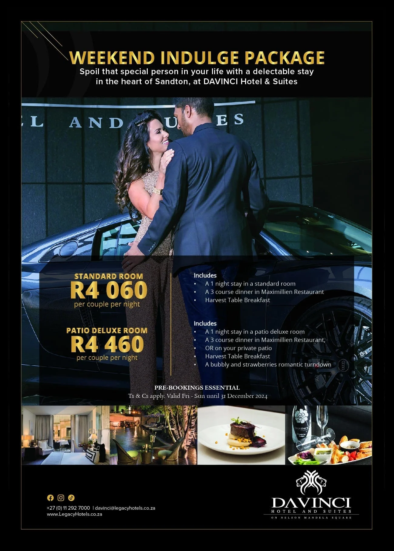 “Spoil that special person in your life with a delectable stay in the heart of Sandton, at Davinci Hotel & Suites. Standard room – R4 060 per couple per night Includes • A 1 night stay in a standard room • A 3 course dinner in Maximillien Restaurant • Harvest Table Breakfast Patio Deluxe Room […]